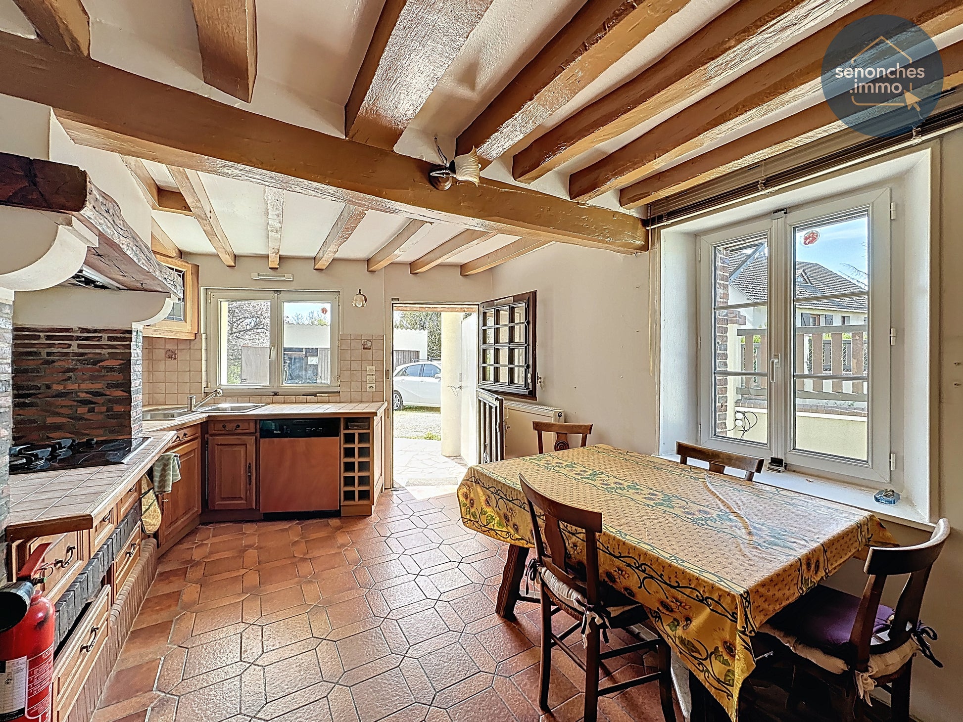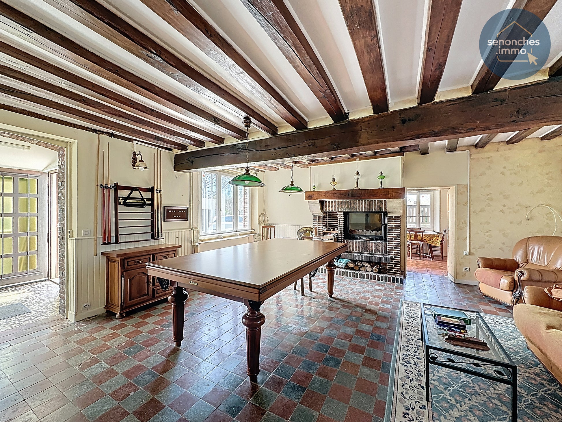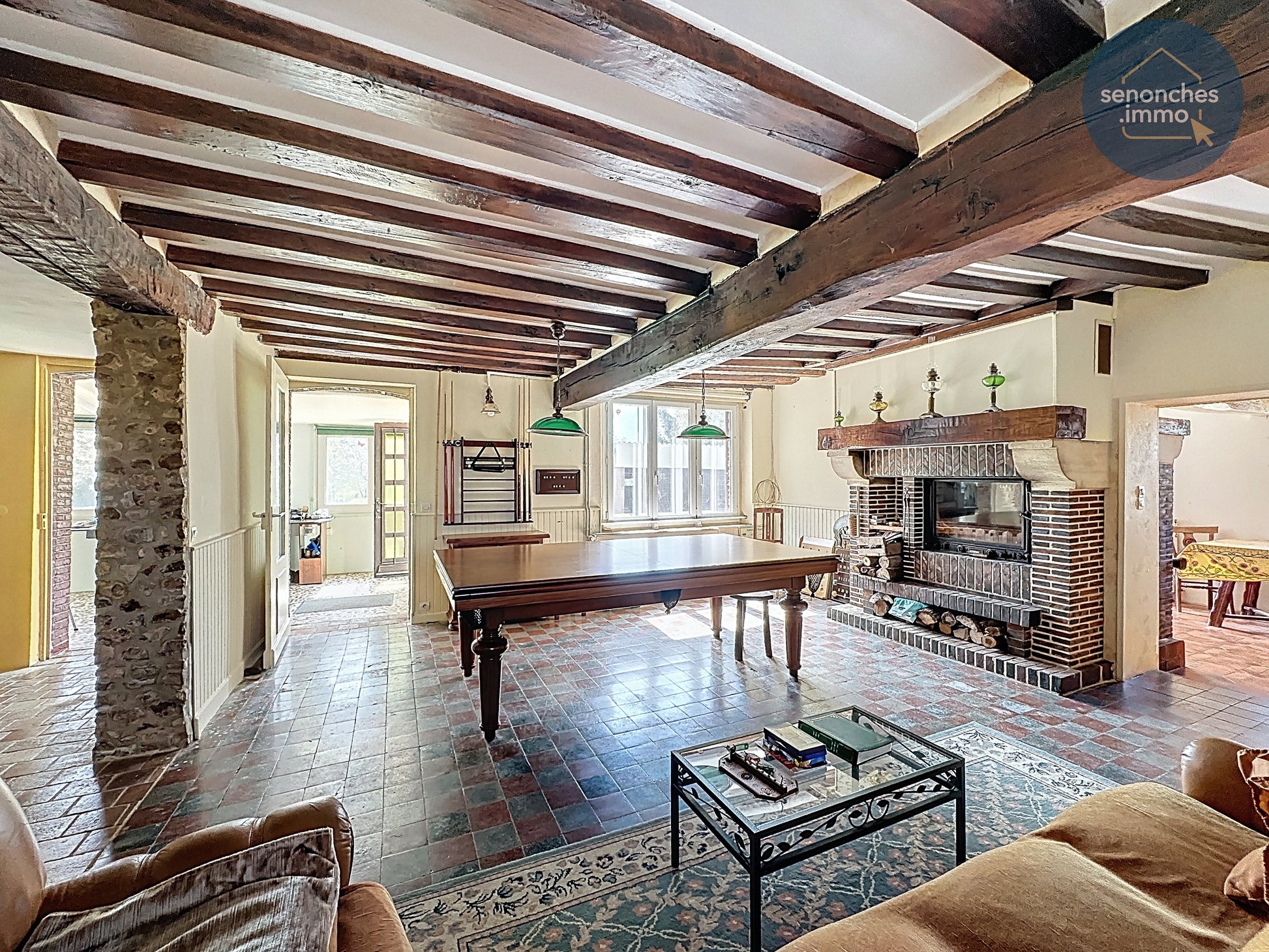 Dès l’entrée, la cuisine équipée et aménagée d’environ 13,75 m² propose un espace fonctionnel et lumineux, en lien direct avec la vaste pièce de vie de 42 m². Ce volume central constitue le cœur de la maison, avec une présence affirmée de l’insert cheminée qui renforce le caractère convivial de l’ensemble et accompagne parfaitement l’esprit de cette longère ancienne.
